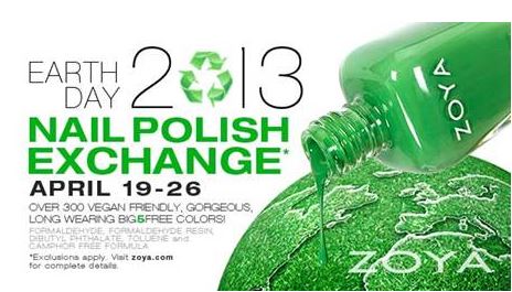 Hooray for Earth Day! Once again, Zoya is helping you do a little spring cleaning with the return of the Earth Day Zoya Nail Polish Exchange* for 2013. Clean out your nail polish wardrobe and get rid of old nail polish that may not be BIG5FREE (Free of Formaldehyde, Formaldehyde Resin, Toluene, DBP and Camphor) and exchange it for a greener alternative – long lasting, award winning, healthy Zoya Nail Polish bottles!