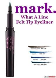 mark What a Line Felt Tip Eyeliner is available in brownie points, denim, twilight, and wee hours. The fine felt tip allows me to define and line my eyes perfectly and it stays in place all day. This was my fist time to use a felt tip eyeliner and it glides on smoothly and is very easy to apply even for a beginner.