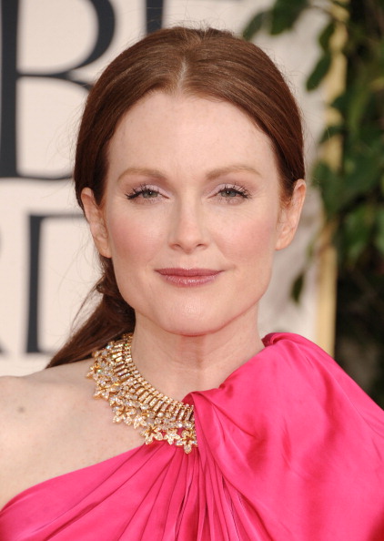 Julianne Moore looked radiant last night on the red carpet of the Golden Globe Awards in a dazzling pink, Lanvin dress. Nominated for Best Actress in The Kids Are All Right, her co-star Annette Benning took home the prize for the same film. Moore’s flawless makeup was created by Pati Dubroff, Clarins Celebrity Beauty Artist. A fuchsia dress on a red head can be difficult to match makeup to, but Dubroff chose to stay within the pink family creating contrasting hues on the eye lids (soft pink) and deep, rich blackberry on the lips.